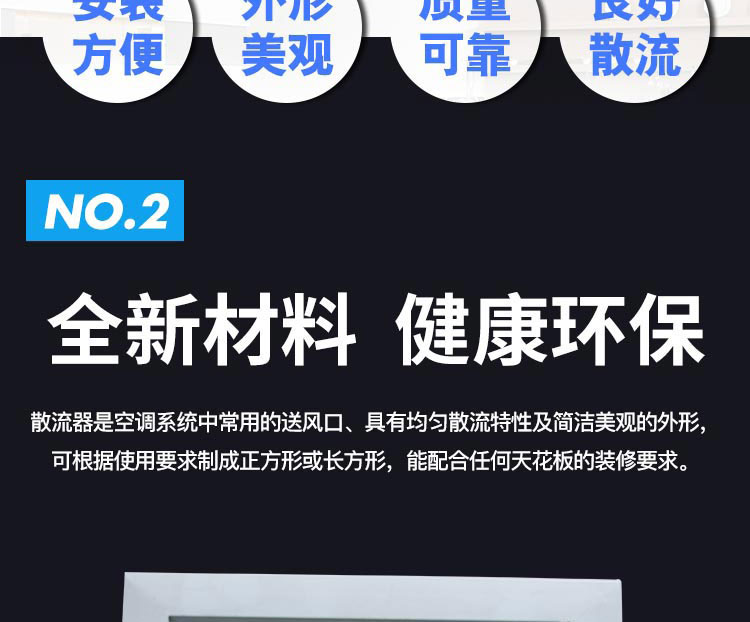 方形散流器(鋁合金散流器)優(yōu)點及適用范圍:氣流屬貼附(平送)型,適用于播音室、醫(yī)院、劇場、教室、音樂廳、圖書館、游藝廳、劇場休息廳、一般辦公室、商店、旅館及體育館等。