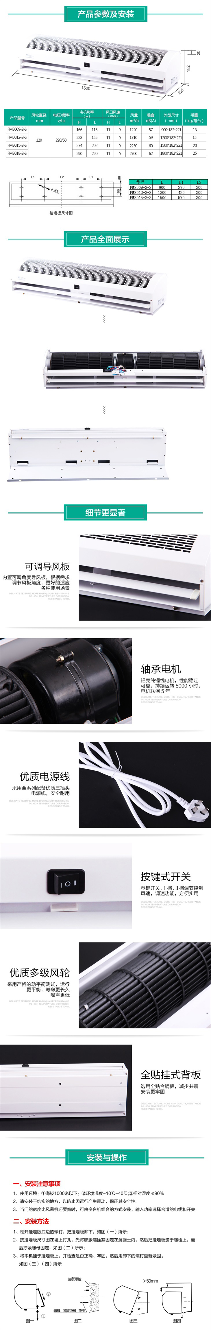 一、產品特點FM系列風幕機是采用單相電容運行式電動機驅動,帶動外形勻稱的貫流鋁合金風輪,或增強塑料風輪產生分布均勻的幕式氣流,可減少和阻隔室內外空氣對流。PFM-I系列熱風幕機里用電熱管通電原理產生熱源,RFM-Ⅱ系列暖風幕機熱源采用第三代PTC發熱原件