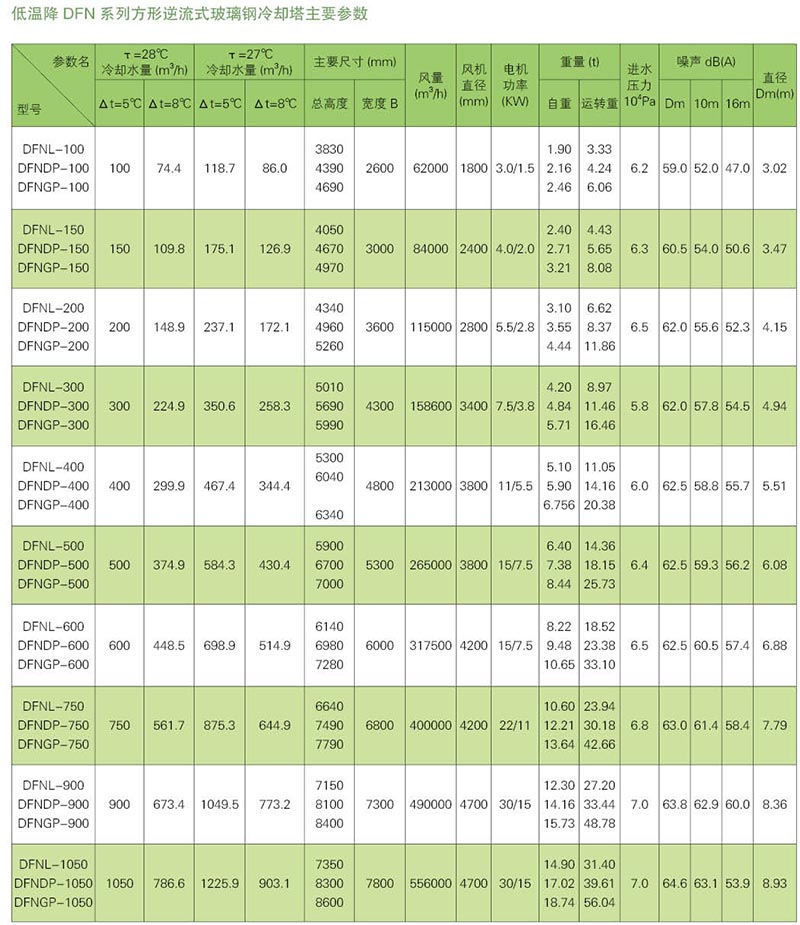采用清華大學專為冷卻塔而設計的FRP材質的機翼低噪聲軸流式風機和專為冷卻塔而設計的低噪聲電機,從而降低了冷卻塔的運轉噪聲。超低噪聲系列冷卻塔的運轉噪聲更低,全面符合環保要求。若配用雙速電機,在夜間低速運行時,還能使噪聲再下降2-3dB(A),用戶需要雙速電機應在訂貨時單獨提出要求。