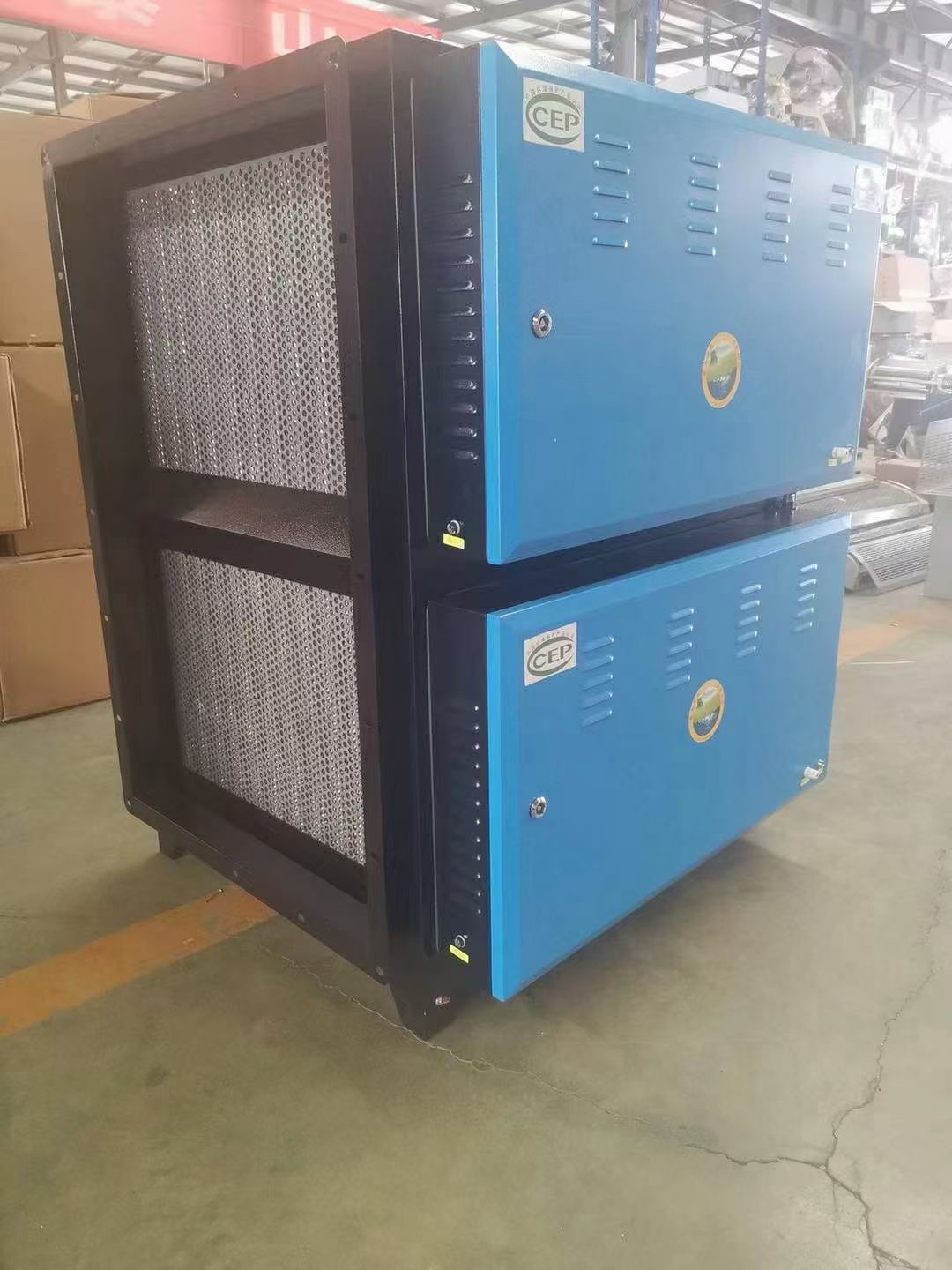 2、高效過濾消聲段:經過前端處理后,去除了大部分油煙,而逃逸的微米級油煙氣被后置的高效過濾段(粗過濾和精過濾)處理后大部分被過濾,余下的亞微米級的油霧微粒和煙氣中有毒有害物質及異味等進入低溫等離子體凈化段處理。