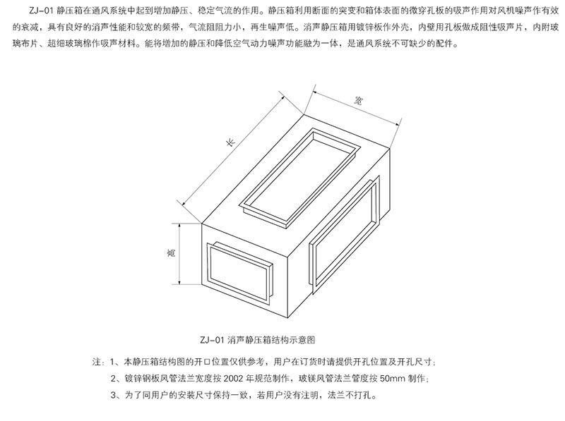 4、ZS靜壓箱可用來減少噪聲,又可獲得均勻的靜壓出風,減少動壓損失。而且還有萬能接頭的作用。把靜壓箱很好地應用到通風系統中,可提高通風系統的綜合性能;