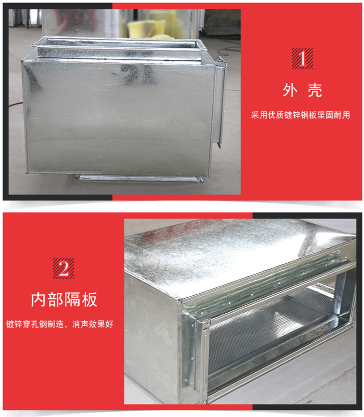 3、阻抗復合式:當然是結合二者的結構原理。可以消除低中高頻噪音。但是對風系統的要求同阻式消聲器。對于一般的民用空調通風系統,我個人認為選用阻抗復合消聲器為好。 阻性消聲器具有良好的中高頻消聲性能。按氣流通道幾何形狀不同,可分為直管式、片式、折板式、迷宮式、蜂窩式、聲流式、障板式、彎頭式等。抗性消聲器適用于消除中低頻噪聲或窄帶噪聲。按其作用原理不同,可分為擴張式、共振腔式和干涉式等多種型式。阻抗復合式消聲器,有共振腔、擴張室、穿孔屏等聲學濾波器件,綜合了阻性消聲器良好的中高頻消聲特性和阻抗性消聲器較好的低頻消聲特性,因此其消聲頻帶寬,它是最常用的標準消聲器系列之一。適宜風速為6~8米/秒,最高可達到8~12米,可單獨使用,也可串聯使用。消聲效果:低頻10~15dB/m,中頻15~25dB/m,高頻25~30dB/m,平均阻力系數為0.4。根據《空氣調節》,消聲彎頭、消聲靜壓箱均屬于消聲器的一種。